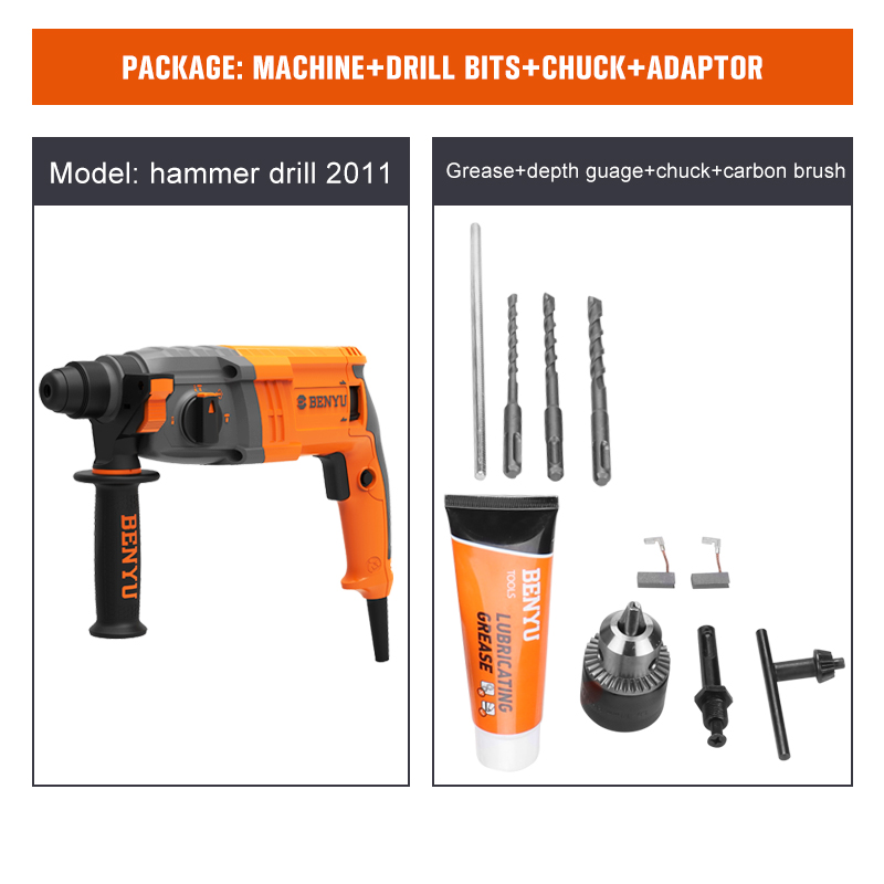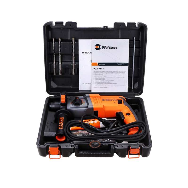 Designed for the toughest applications, BENYU hammer drill has longer duration ofhammer drilling than other tools in its class. It is also easily to use and avoid user fatigue. With a powerful motor, it delivers superior drilling speed and bigger torque. A mechanical clutch protects the motor when the bit binds, and multi-mode operation offers maximum versatility.