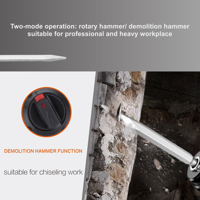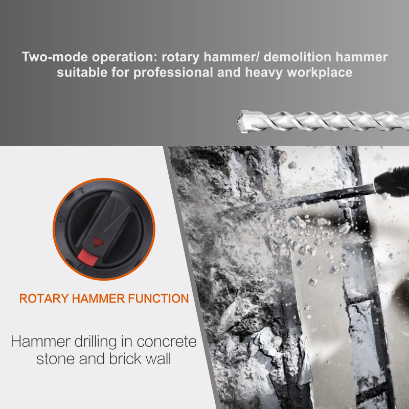 Rotary hammer/demolition hammer function is suitable for heavy workplace.